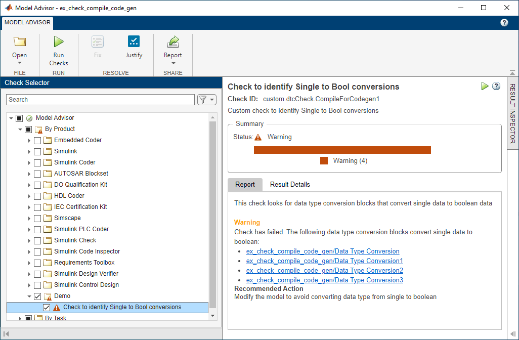 • PostCompile specifies that the Model Advisor must compile the model to update the model diagram and then simulate the model to execute your custom check. The Model Advisor does not flag modeling issues that fail during code generation because these issues do not affect the simulated model.