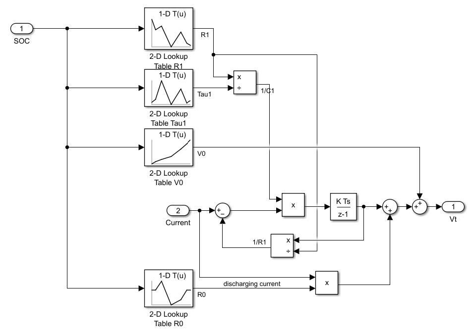 In the estimation model, a linear parameter-varying model is constructed according to the battery cell equivalent circuit. This is a first-order linear system with changing parameters organized using lookup table blocks