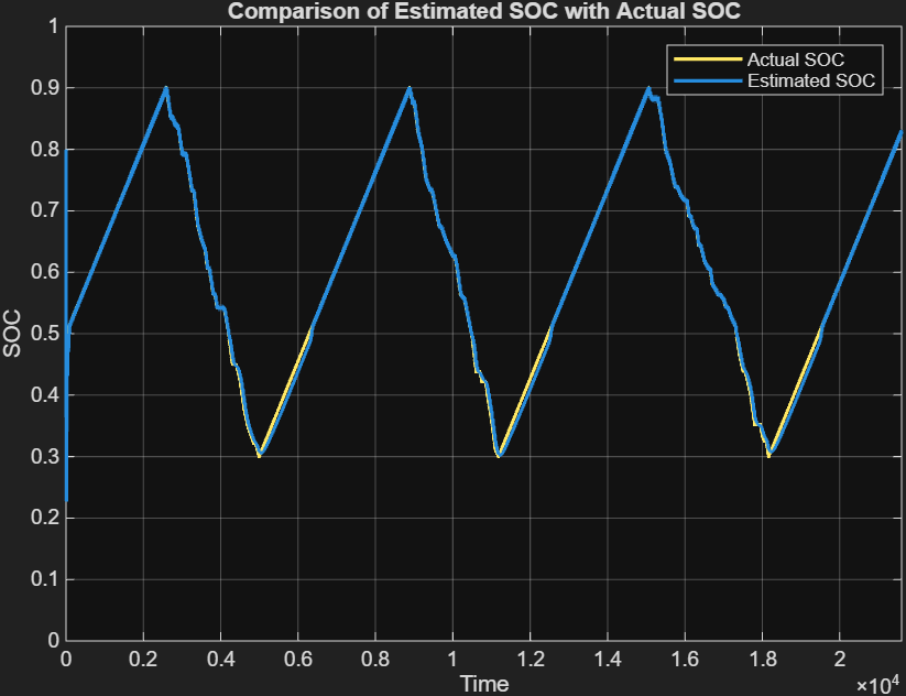The simulation result shows that the estimated SOC level follows the charging and discharging cycles closely. At the beginning of simulation, the estimated SOC level also converges faster to the truth value compared to the existing SOC estimator blocks.