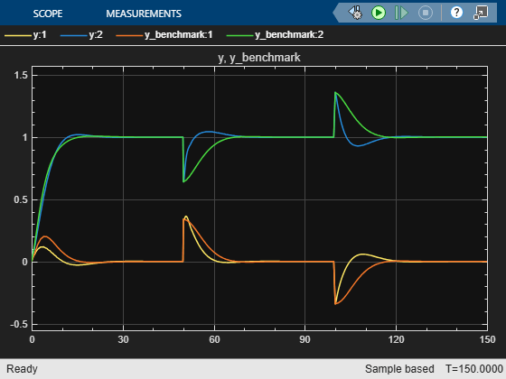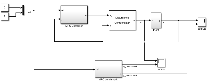 open_system(mdl + "/outputs")The design with disturbance compensation shows improved disturbance rejection compared to the benchmark MPC. The outputs converge more quickly to their reference values, though this comes at the cost of larger control effort.