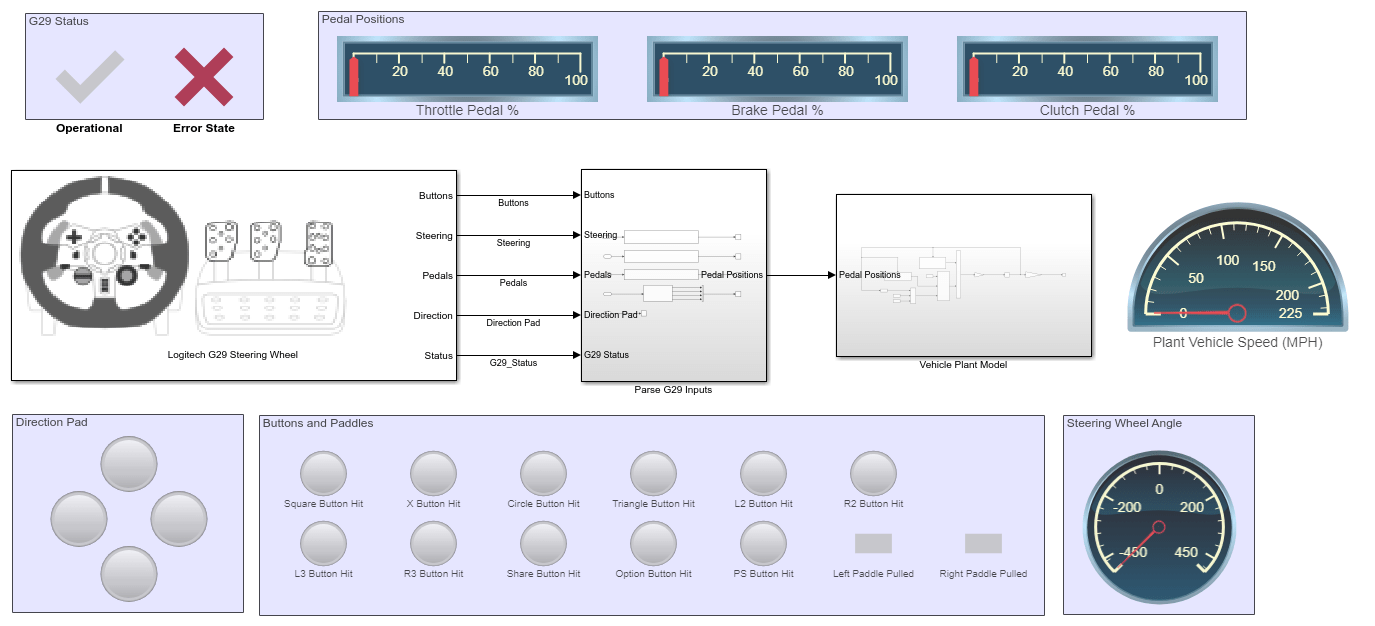 This example shows how to configure and use a Logitech G29 Steering Wheel block. This reads inputs from a Logitech G29 Steering Wheel device that is connected to the target computer.