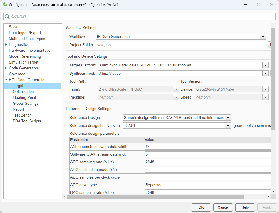 In the Configuration Parameters dialog box of the model, set the HDL workflow, target platform, and reference design by following these steps.