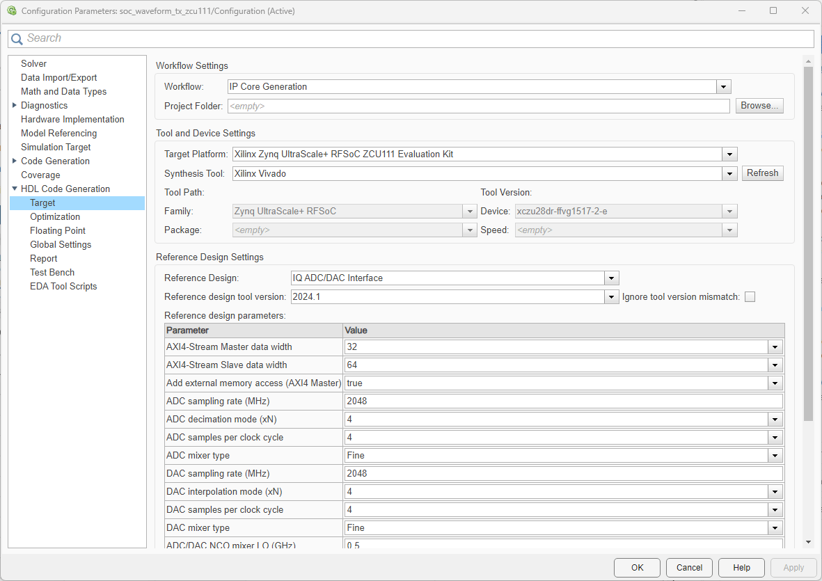 3. Set Target Platform to Xilinx Zynq UltraScale+ RFSoC ZCU111 Evaluation Kit. Ensure that the Synthesis Tool is set to Xilinx Vivado.
