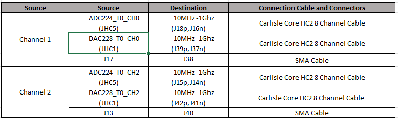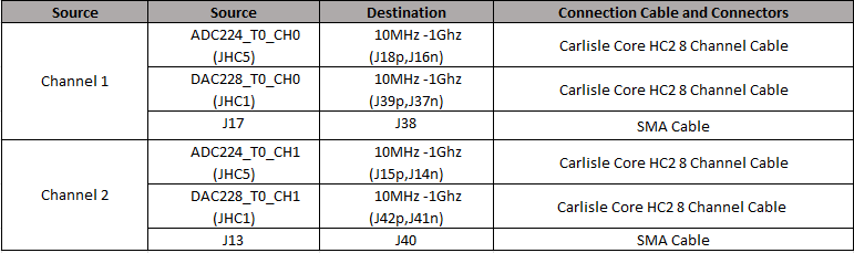 Connect the SMA connectors on the XM755 Balun card to complete the loopback between the DAC and ADC channels, according to the connections in this table.