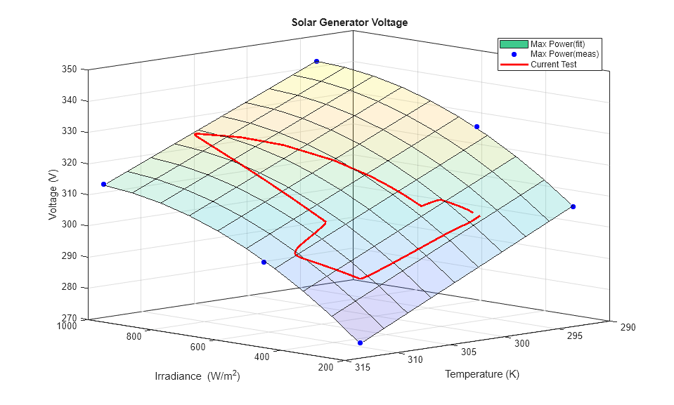 The plot below shows the voltage output of the panel with respect to panel temperature and irradiance. For a given temperature and irradiance, solar panels have a voltage draw that will result in maximum efficiency. The blue dots on the plot are measurements from specific tests, and the surface is a polynomial fit to those points. The control system attempts to keep the voltage drawn from the panel such that it is on this surface and maximizes the efficiency of the panel.
