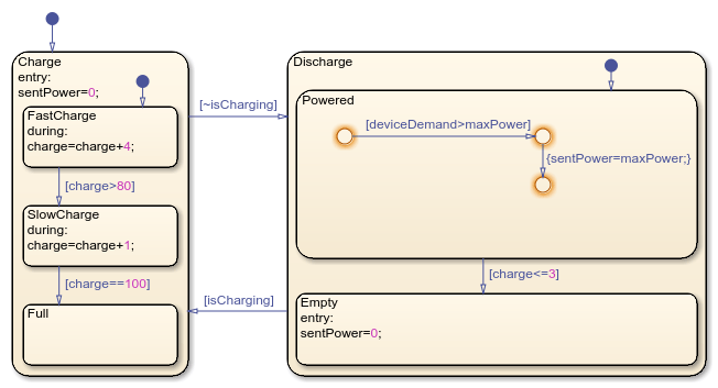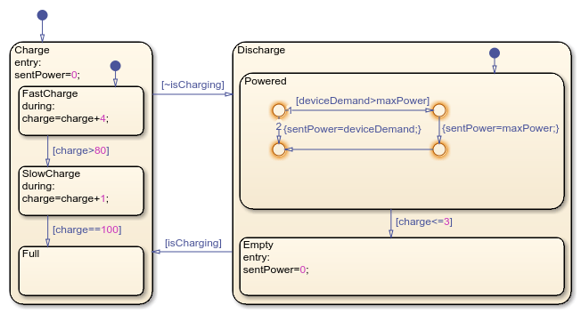 Im nächsten Schritt des Tutorials fügen Sie eine nicht wiederaufladbare Reservebatterie hinzu, die wesentliche Funktionen aufrechterhält, wenn sich die Hauptbatterie entleert. Um den simultanen Betrieb der Batterien zu modellieren, verwenden Sie parallele Zustände und Ereignisse.