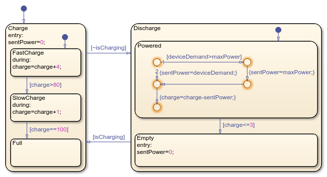 In diesem Beispiel fügen Sie ein Flussdiagramm einem Modell eines aufladbaren Batteriesystems hinzu. Das Flussdiagramm passt die Leistung des Batteriesystems an den Bedarf des verbundenen Geräts an, ohne die Grenzwerte der Batterie zu überschreiten.