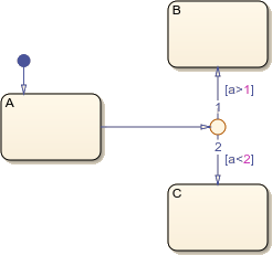 In Stateflow bezeichnet ein Flussdiagramm ein Diagramm oder einen Zustand, dessen untergeordnete Elemente ausschließlich aus Verbindungen und Übergängen bestehen. Alle Pfade in einem Flussdiagramm müssen bei einer einzigen geteilten Verbindung enden. Sie können ein Flussdiagramm auf jeder Ebene einer Diagramm-Hierarchie erstellen.