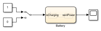 Chargeals auchFastChargeaktiviert. Wennchargeansteigt, geht das Diagramm in die untergeordneten ZuständeSlowChargeundFullüber. Im Fensterbereich Symbols übersteigtchargeniemals100.Kehren Sie zum höchsten Simulink-Modell zurück. Schalten Sie den Wert des Blocks „Manual Switch“ um, indem Sie auf den Block doppelklicken.
