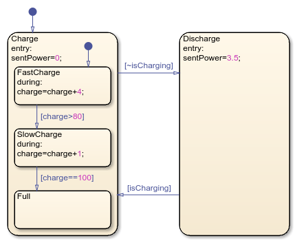 In diesem Beispiel verwenden Sie untergeordnete Zustände, um die variablen Laderaten in einem wiederaufladbaren Batteriesystem zu modellieren.