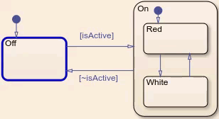 In diesem Modell der Rundumleuchtanlage eines Rettungswagens weist der Zustand On die untergeordneten Zustände Red und White auf. Ist On aktiv, wechselt der Rettungswagen zwischen den farbigen Lichtern, beginnend mit dem Zustand Red. Wird On deaktiviert, werden beide Lichter deaktiviert.