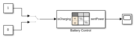 The State Transition Table block Battery Control contains the control logic for the system. To determine whether the battery charges or discharges, the table receives a Manual Switch block as an input.