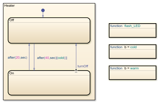 Die Übergänge zwischen den Zuständen On und Off werden mithilfe des Operators after zeitlich festgelegt. Zum Beispiel löst after(20,sec) nach 20 Sekunden den Übergang von On zu Off aus. Die Übergangskennzeichnung after(40,sec)[cold()] löst den Übergang von Off zu On aus, wenn die Funktion cold nach 40 Sekunden true zurückgibt.