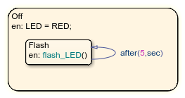 Der Off-Zustand verwendet einen Subzustand namens Flash mit einem Schleifen-Übergang zur Steuerung einer Zustands-LED. Die Übergangskennzeichnung after(5,sec) löst die Eintrittsaktion des Substatus aus und lässt die LED alle 5 Sekunden blinken.