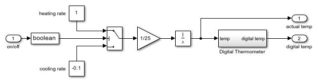 Das Boiler Plant Model-Subsystem simuliert die Temperaturreaktion des Kessels während der Heiz- oder Kühlperioden. Je nach Ausgabe des Bang-Bang Controller-Diagramms addiert das Subsystem +1 zur vorherigen Kesseltemperatur zum Heizen oder subtrahiert –0.1 davon zum Kühlen. Das Diagramm gibt das Ergebnis dann an das Digital Thermometer-Subsystem weiter.