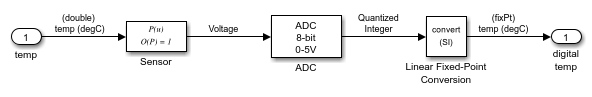 Das Bang-Bang Controller-Diagramm empfängt dann diese digital codierte Temperatur und interpretiert sie als vorzeichenlose 8-Bit-Festkommadaten. Das Diagramm verarbeitet die Temperaturdaten in einer 8-Bit-Umgebung.