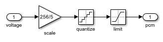 Der Analog-Digital-Wandler-Block wandelt die analoge Spannung in diskrete 8-Bit-Werte um. Das System multipliziert die Spannung mit einem Umrechnungsfaktor, rundet das Ergebnis auf die nächste ganze Zahl und begrenzt es auf 8 Bit. Das Ergebnis ist eine quantisierte Ganzzahl.