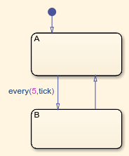 For example, in this chart, state A has both an inner transition and a transition out of the state. Both transitions contain an every operator that executes when the tick implicit event triggers.