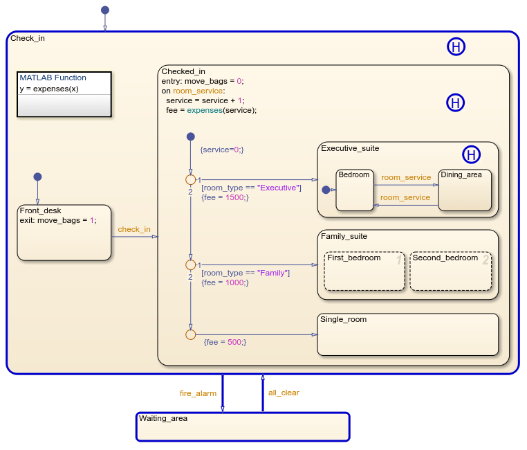 room_typegleich"Executive"ist, ist der obere Übergang gültig. Die Bedingungsaktion setzt die Diagrammausgabe vonfeeauf 1500 und der TeilzustandExecutive_suitewird aktiv.Wenn die Eingabe in das Diagramm