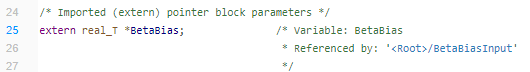 To make BetaBias represent a global variable that the external code defines, use the built-in storage class ImportedExternPointer. To learn more about storage classes, see ImportedExtern, ImportedExternPointer (Embedded Coder). Lastly, set the GenCodeOnly="on" to only generate code without building the executable.