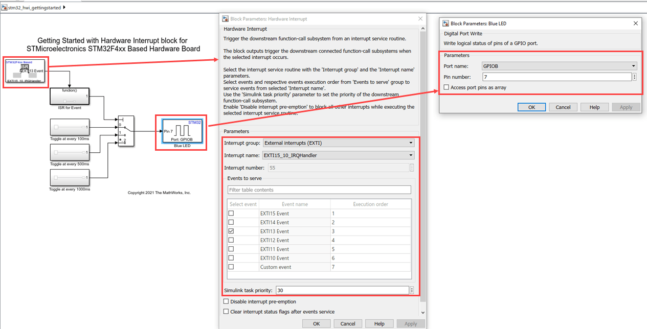 In this example you will learn how to configure a Simulink model with Hardware Interrupt block to generate code and make a blue LED blink at different rates on the press of a button on the STMicroelectronics NUCLEO-F429ZI board.