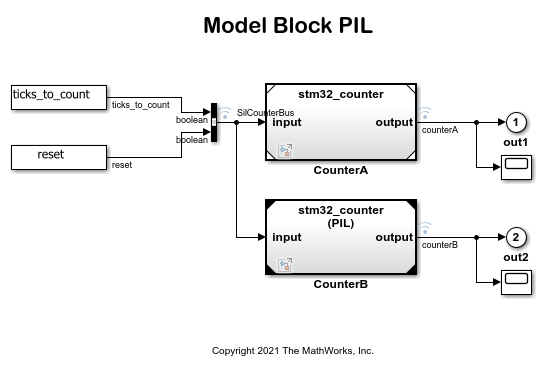 1. Open the stm32_model_pil_block model. This model is configured for STM32 Processor Based Boards target. Configure one of the Model blocks to run in the PIL simulation mode and the other in the normal mode.