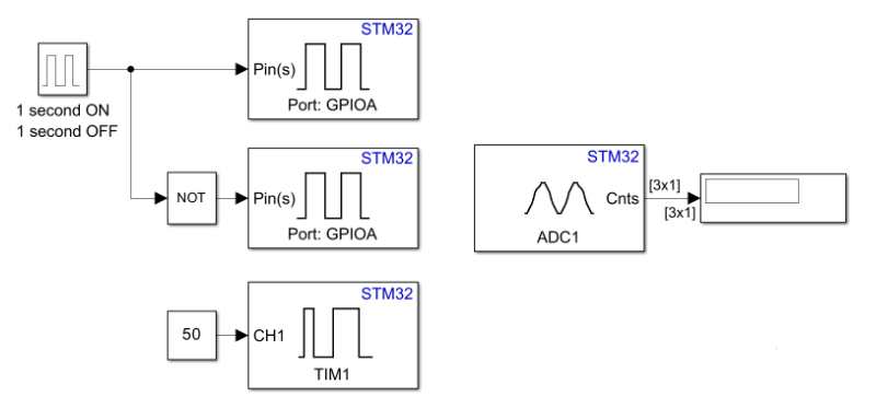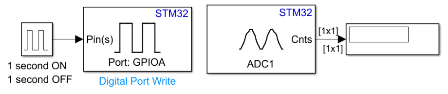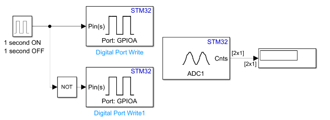 This example shows how to use Connected IO in STM32™ Microcontroller Blockset. It illustrates how to progressively add blocks and use Connected IO to read and write values to and from target hardware.