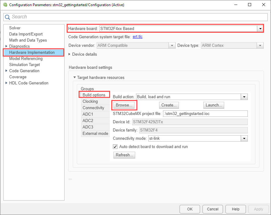3. Press Ctrl+E to open the Configuration Parameters dialog box. Then, select the STM32 processors hardware board by navigating to Hardware Implementation > Hardware board.