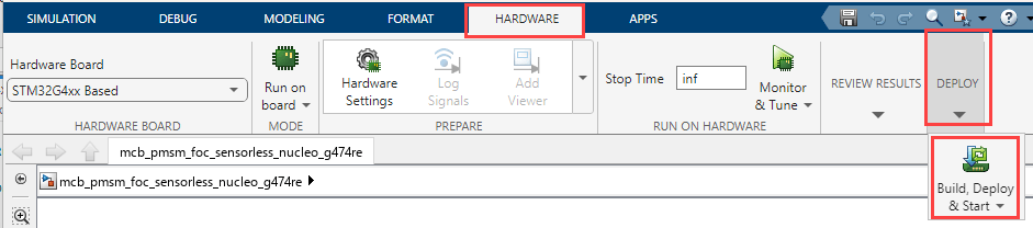 You can use the mcb_pmsm_foc_sensorless_nucleo_f401re or mcb_pmsm_foc_sensorless_nucleo_g474re model with the X-NUCLEO-IHM07M1 expansion board for both simulation and code generation. You can also use the open_system command to open the Simulink® models. For example, use this command for a STM32 Processor based Boards: