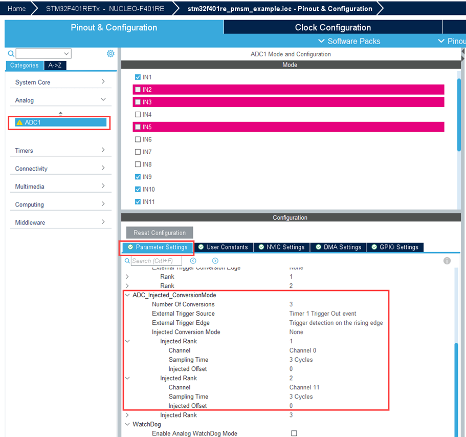 The ADC channel is configured to read current feedback from the injected group conversions of ADC 1 and the reference speed from regular group conversions.