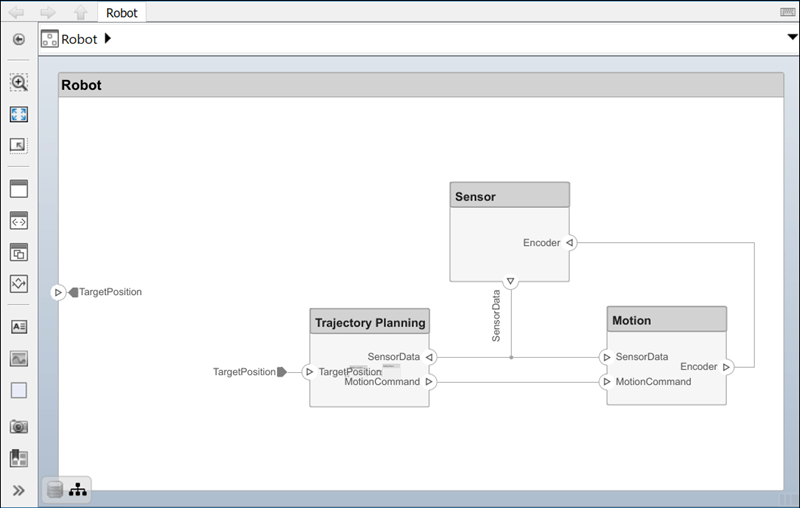 Öffnen Sie das Architekturmodell eines Roboterarms, der aus Sensoren, Bewegungsaktuatoren und einem Planungsalgorithmus besteht. Mit System Composer können Sie die Schnittstellen anzeigen und die Anforderungen für dieses Modell verwalten.