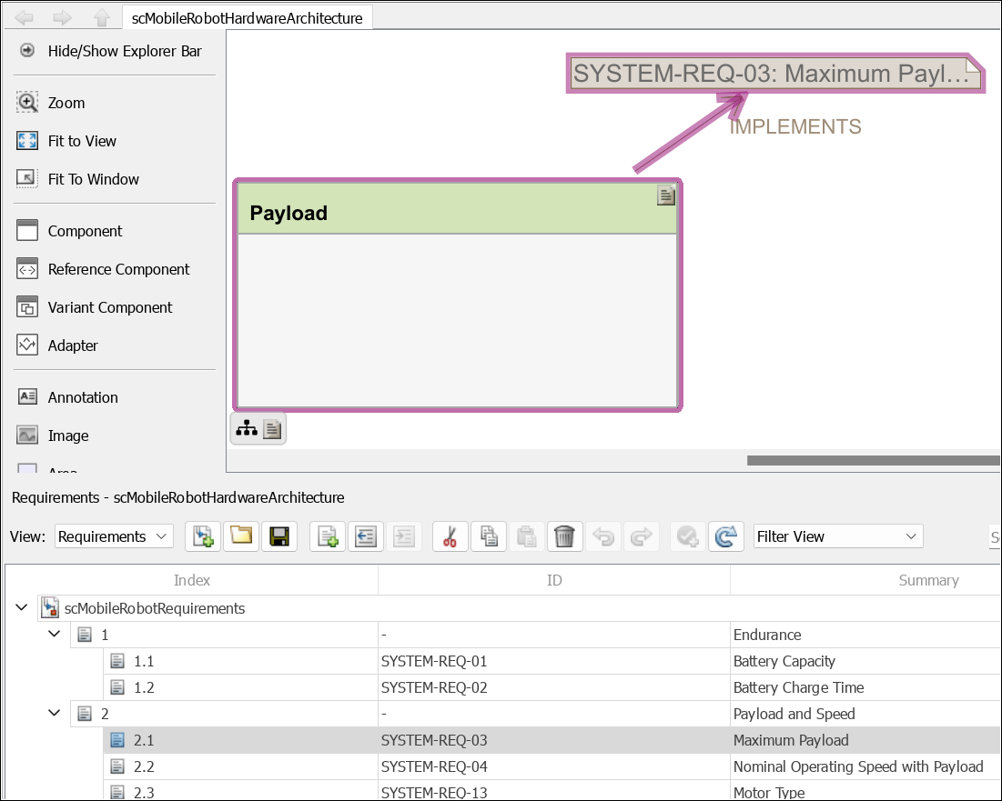 The Payload component in the physical architecture model implements the Maximum Payload requirement SYSTEM-REQ-03. To show or hide linked requirements, click the requirement icon on the top-right corner of a component.