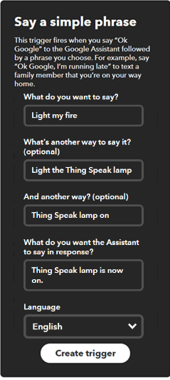 5) Geben Sie einen Satz ein, um Ihre Lampe auszulösen. Da der Assistent auch Websuchen durchführen kann, vermeiden Sie einfache Muster wie Turn light on. In diesem Beispiel wird die Phrase Light my fire verwendet, um die Lampe einzuschalten.