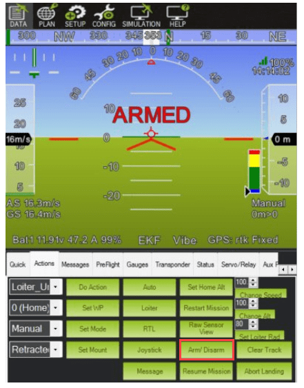 To arm the plane, from the Data tab, go to Actions tab, and then click Arm/Disarm. The display changes from Disarmed to Armed.
