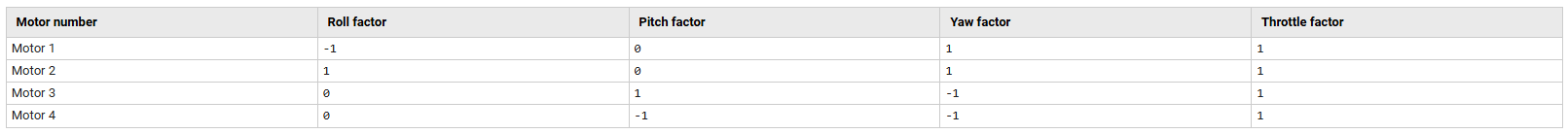 The mixer matrix is organized with four columns, where each column contains the throttle factor, roll factor, pitch factor, and yaw factor for each motor. These factors determine how much each control input (throttle, roll, pitch, yaw) contributes to the output of each motor.