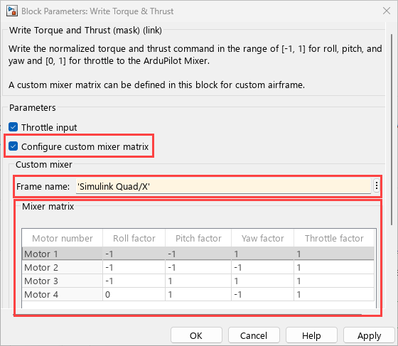 imulink Quad/X. The default mixer matrix is for Simulink Quad/Plus. For this example, modify it for Simulink Quad/X.Add or remove motor rows using the table UI.You must include at least 4 motors, and you can add up to 12.
