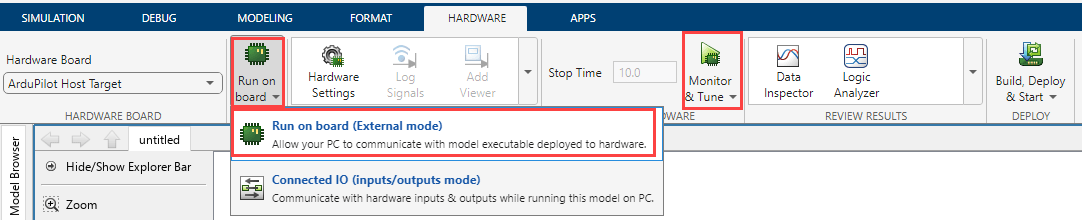 You can run the Simulink model on actual hardware by configuring your flight controller and repeating the Simulink configuration steps used for host simulation (excluding SITL-specific steps).