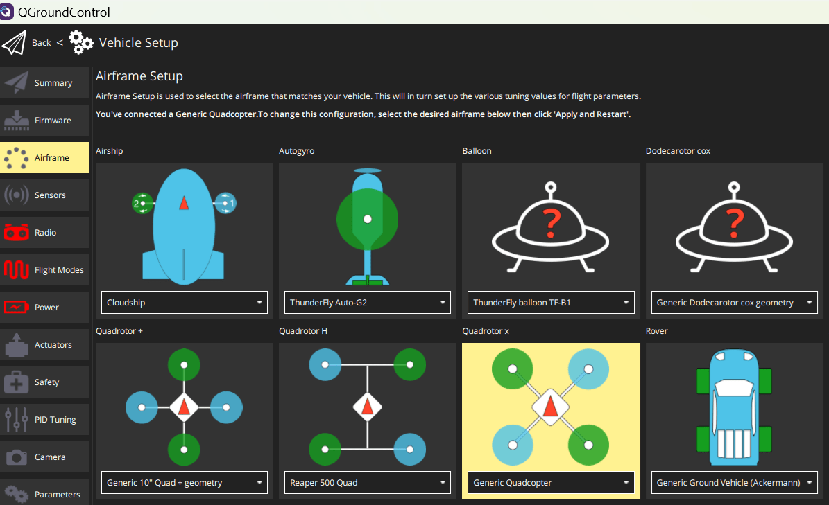 Select Generic Standard Plane. Click Apply and Restart on top-right of the Airframe Setup page.