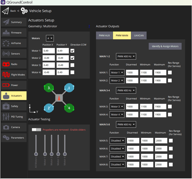 3. Navigate to Actuators tab and identify and assign the main motors.