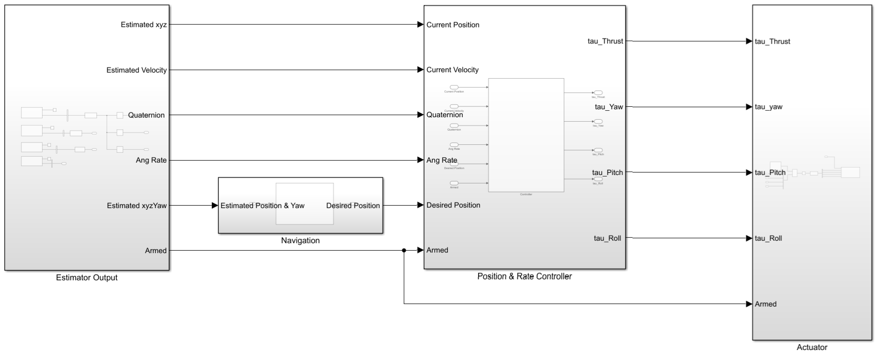 Position & Rate Controller - Takes Current Position, Current Velocity, Quaternion, Angular rate, Desired Position and Arm status as inputs from the Estimator output and Navigation subsystems. It uses discrete PID(z) and P(z) controllers in different configurations to obtain the desired