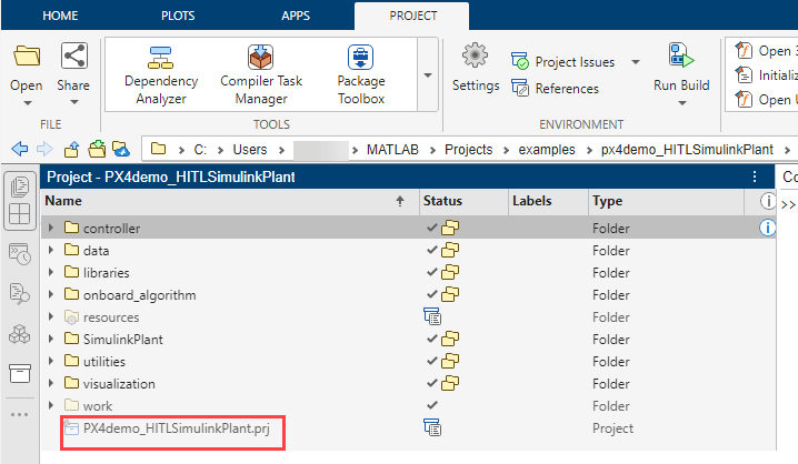 This example uses PX4demo_HITLSimulinkPlant.prj project which includes two Simulink models: the controller model (Quadcopter_ControllerWithNavigation.slx) and the UAV dynamics model (UAV_Dynamics_Autopilot_Communication.slx).