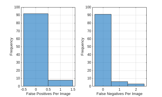 figure; subplot(1,2,1) histogram(imageSummary.FP) xlabel("False Positives Per Image") ylabel("Frequency") grid on subplot(1,2,2) histogram(imageSummary.FN) xlabel("False Negatives Per Image") ylabel("Frequency") grid on