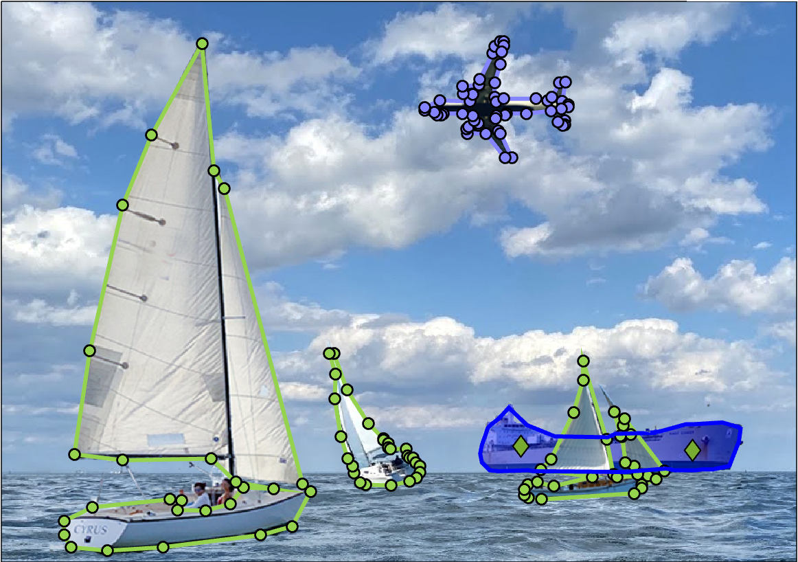 Continue to label other sailboats in the scene by marking new object points. Label sailboats object-by-object, and press Enter, or click Accept after you are done drawing each label.