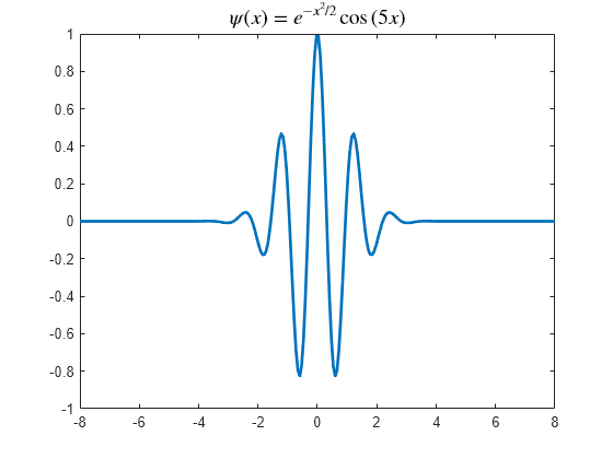 figure [psi,xval] = wavefun('morl'); plot(xval,psi,'linewidth',2) title('$\psi(x) = e^{-x^2/2} \cos{(5x)}$','Interpreter','latex',... 'fontsize',14);