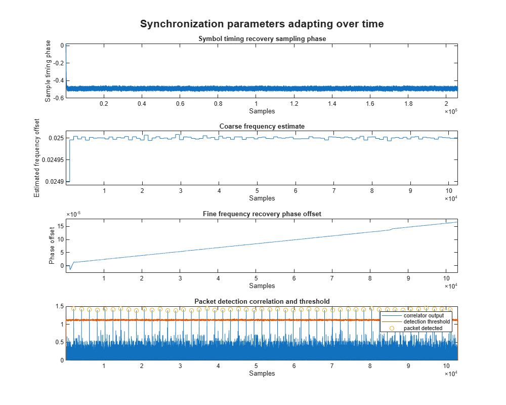 This example is designed for continuous data transmission and reception. Using continuous data allows the receiver to perform blind symbol timing recovery and frequency synchronization, and adapt the calculation over several packets. Systems designed for short, discrete bursts require more complex packet structures and more complex receiver algorithms to ensure the receiver synchronization algorithms can adapt quickly for each received packet.