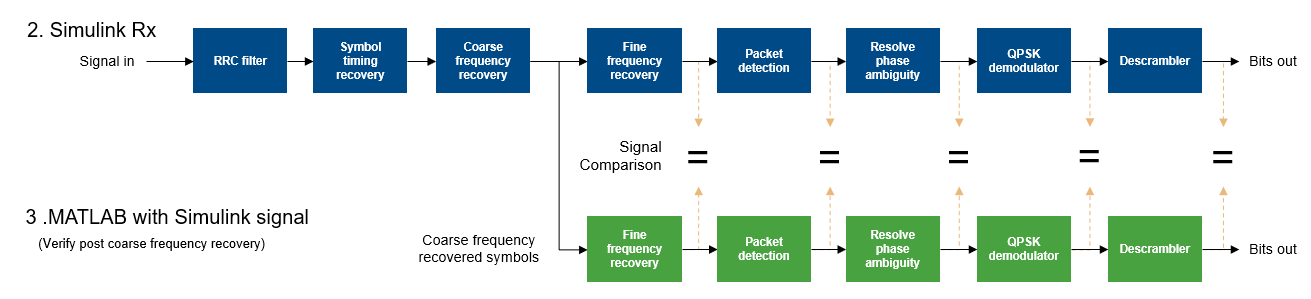 Verify the processing steps after coarse frequency compensation by rerunning the MATLAB code for these steps using the output signal from the Simulink coarse frequency recovery block. Comparison of the MATLAB and Simulink outputs shows that they are bit-true and cycle-accurate, once the differences introduced by the coarse frequency recovery stage are taken into account.