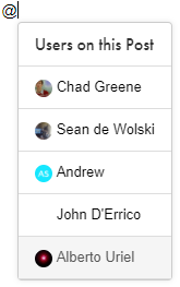 Once you type the @ character a popup will appear listing the community members already in the Q/A thread, as you keep typing the list will expand to include members not in the thread. A mentioned user will receive a notification when the question/answer/comment is posted. Each mention in the Q/A thread will have a new visual style and link to the user profile for that community member.