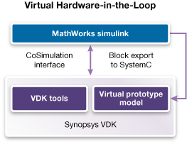 Virtualizer Development Kits (VDKs) can be used in conjunction with Simulink, enabling cosimulation of Simulink models with Virtualizer Development Kits. Use Simulink® Coder™ to code and integrate Simulink models within the model of the Vitualizer Development Kits. This integration enables developers to simulate complete systems including the physical plant, the target hardware, and the embedded software. The integration of Simulink with Synopsys VDKs enables the use of virtual rapid prototyping, virtual embedded software testing, and virtual hardware-in-the-loop development environments.