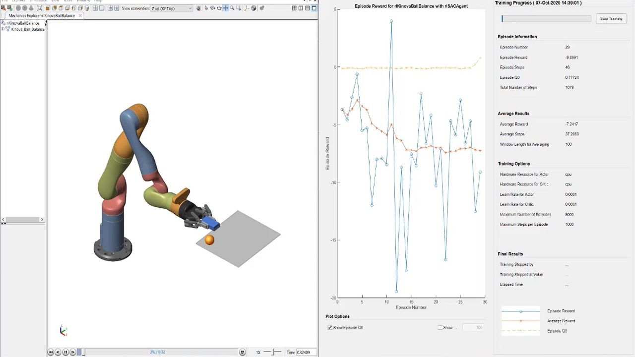 Entwerfen, trainieren und simulieren Sie interaktiv Reinforcement-Learning-Agenten. Exportieren Sie trainierte Agents in MATLAB zur weiteren Verwendung und Bereitstellung.