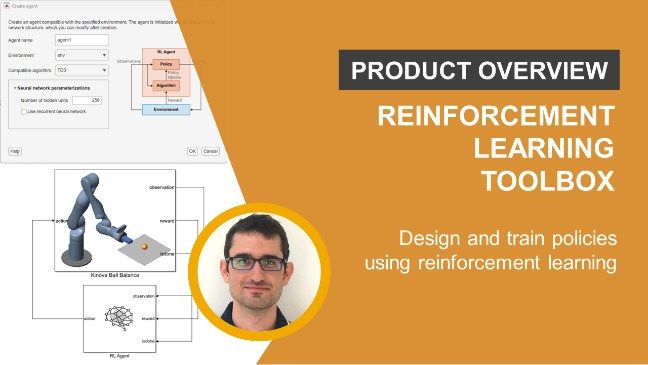 Die Reinforcement Learning Toolbox bietet eine App, Funktionen und einen Simulink®- Block zum Trainieren von Strategien mit Reinforcement-Learning-Algorithmen wie DQN, PPO, SAC und DDPG. Mithilfe dieser Strategien können Sie Steuerungen und Entscheidungsalgorithmen für komplexe Anwendungen wie Ressourcenzuweisung, Robotik und autonome Anlagen implementieren.